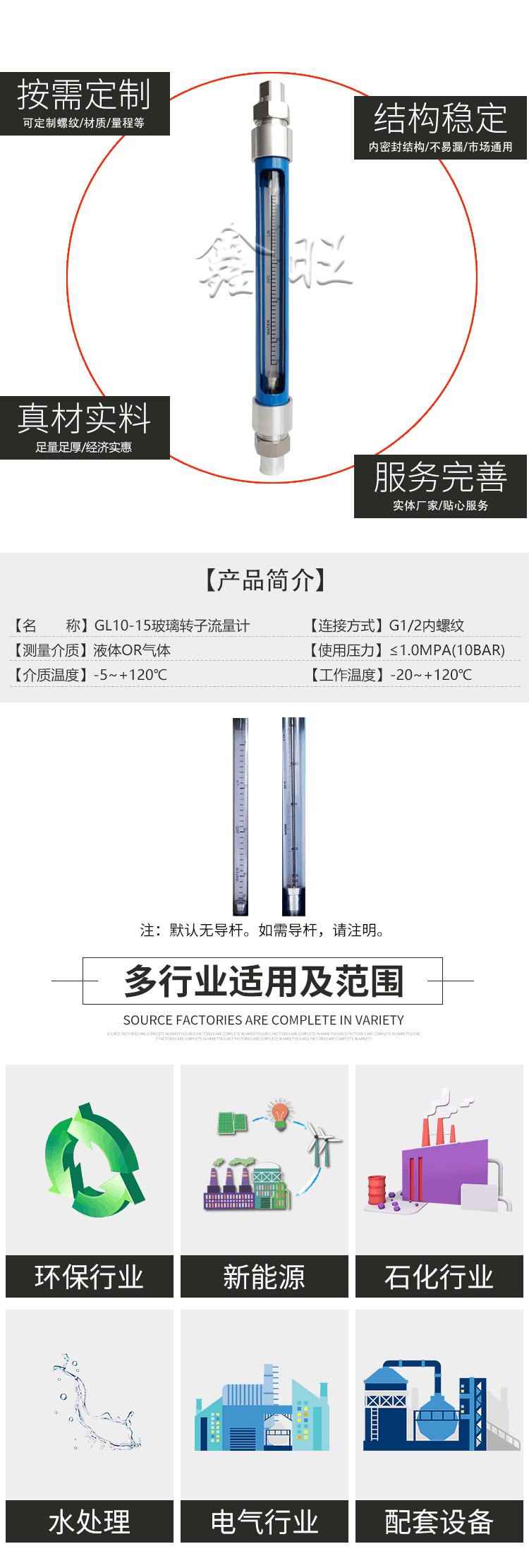 GL/RL/FL10、20、30型玻璃轉(zhuǎn)子流量計可替代引進成 套設備上的玻轉(zhuǎn)儀表,廣泛應用于化工、輕工、制藥、 食品、造紙、環(huán)保和計量測試、科研等部門,測量單相 非脈動流體(液體或氣體)的流量。