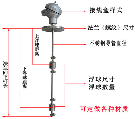 簧片開關與每一個預定測出或報警的液位是固定的,導桿又起著浮子導向的作用,浮子隨導桿上下移動,簧片開關處于磁場中時接通,處于磁場外時呈斷開狀態(tài)。