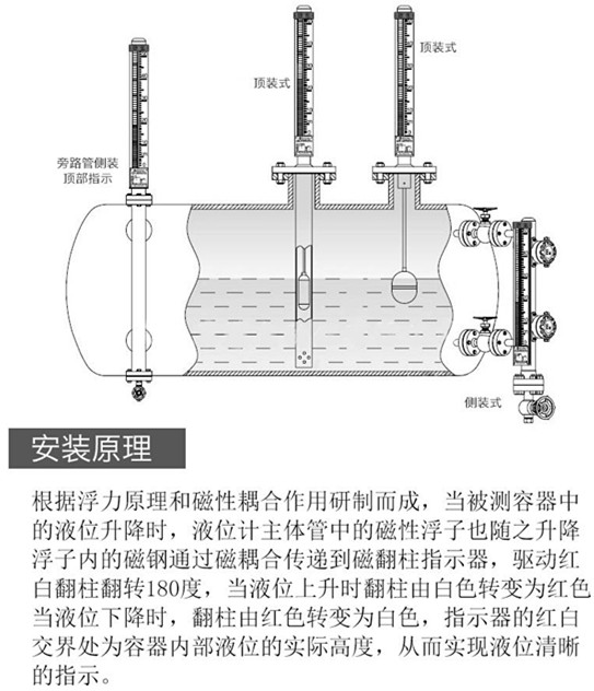 根據浮力原理,浮子在測量管內隨液位的升降而上、下移動,浮子內的永久磁鋼通過耦合作用,驅動紅、白色翻柱翻轉180°,液位上升時翻柱由白色轉為紅色,下降時由紅色轉為白色,從而實現液位指示。